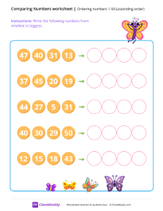 In this comparing numbers worksheet, students arrange numbers (1-50) in ascending order, from smallest to biggest. It is perfect for students to practice number recognition and place value. Worksheet instructions: Write the numbers from smallest to biggest.