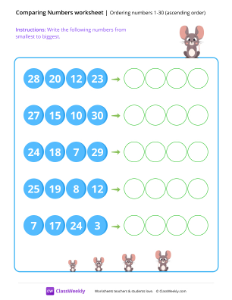 In this comparing numbers worksheet, students arrange numbers (1-30) in ascending order, from smallest to biggest. It is perfect for students to practice number recognition and place value. Worksheet instructions: Write the numbers from smallest to biggest.