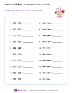 This worksheet helps students practice adding whole hundreds with sums up to 2,000. It strengthens place value understanding, mental math fluency, and multi-digit addition skills. Regrouping of hundreds into thousands may be required for some of the questions. Worksheet instructions: Find the sum for each problem.