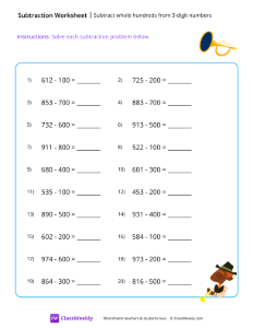 This worksheet helps students practice subtracting whole hundreds from 3-digit numbers (100-999) with no regrouping required. Worksheet instructions: Solve each subtraction problem below.