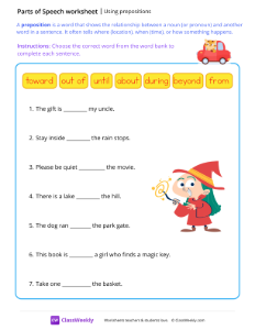 Remember, a preposition is a word that shows the relationship between a noun (or pronoun) and another word in a sentence. It often tells where (location), when (time), or how something happens. Worksheet instructions: Choose the correct word from the word bank to complete each sentence.