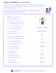 When more than one adjective comes before a noun, the adjectives appear in a particular order. Example: I would like two [number] delicious [opinion], square [shape], Swedish [origin] cookies. Worksheet instructions: Circle the letter with the correct order of adjectives. You can use the right column of the worksheet for help.