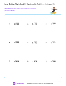 This worksheet lets students practice long division by dividing 3-digit numbers by 1-digit numbers (answer may have remainders). Worksheet instructions: Find the quotient for each division problem