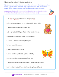 Remember, adjectives are words that describe nouns. They tell us more about a person, place, or thing by giving details about size (tiny, huge), color (blue, red), shape (round, square), feeling (happy, nervous), or other qualities (soft, shiny, delicious). Worksheet instructions: Read each sentence. Circle the adjectives and underline the nouns they describe (there may be more than one of each).