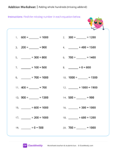 This worksheet is ideal for helping students practice mental math strategies by finding missing addends in addition problems involving whole hundreds, with sums up to 2,000. It reinforces place value understanding, builds fluency in multi-digit addition, and strengthens problem-solving skills. Worksheet instructions: Find the missing number in each equation below.