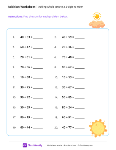 In this addition worksheet, students add whole tens (like 10, 20, 30, etc.) to 2-digit numbers. This helps build fluency with mental math and reinforces place value understanding. Worksheet instructions: Find the sum for each problem below.