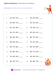 In this addition worksheet, students practice adding three 2-digit whole tens (such as 20 + 30 + 40). This helps strengthen mental math skills, enhances place value understanding, and builds fluency with multi-step addition. Worksheet instructions: Find the sum for each problem.