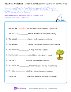 Remember to add "more" or "most" before long adjectives, like "This book is more interesting than that one." Add "er" or "est" to the end of short adjectives, like "This dog is smaller than that one." Worksheet instructions: Circle the correct word to complete each sentence, then write it on the line.