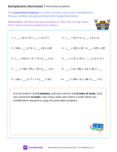 What is the associative property? The associative property is a math rule that states that in multiplication, the way numbers are grouped does not change the product. Worksheet instructions: Use the associative property to fill in the missing values. Then, solve the word problem that follows.