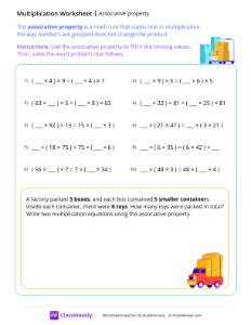 The associative property is a math rule that states that in multiplication, the way numbers are grouped does not change the product. Worksheet instructions: Use the associative property to fill in the missing values. Then, solve the word problem that follows.