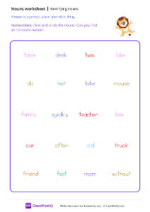 A noun is a person, place, animal or thing. Worksheet instructions: Find and circle the nouns. Can you find all 13 nouns below?