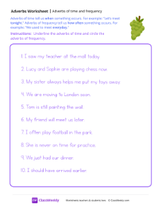 Adverbs of time tell us when something occurs. For example: ”Let’s meet tonight.” Adverbs of frequency tell us how often something occurs. For example: “We used to meet everyday.” Worksheet instructions: Underline the adverbs of time and circle the adverbs of frequency.