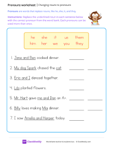 Pronouns are words that replace nouns, like he, she, it, and they. Worksheet instructions: Replace the underlined noun in each sentence below with the correct pronoun from the word bank. Each pronouns can be used more than once.