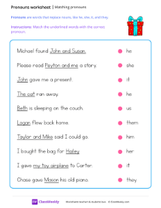 What are pronouns? Pronouns are words that replace nouns, like he, she, it, and they. Worksheet instructions: Match the underlined words with the correct pronoun.