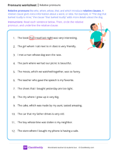 Relative pronouns like who, whom, whose, that, and which introduce relative clauses. A relative clause gives extra information about a word, or idea. For example, in “The dog that barked loudly is mine,” the clause “that barked loudly” adds more details about the dog. Worksheet insturctions: Read each sentence. Then, circle the relative pronoun, and underline the relative clause.