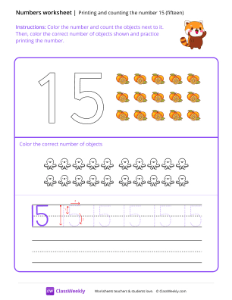 Worksheet instructions: Color the number and count the objects next to it. Then, color the correct number of objects shown and practice printing the number.