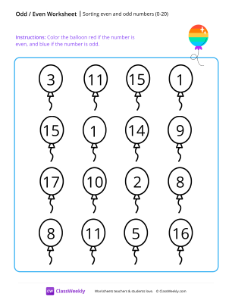 This worksheet helps students practice classifying numbers as even or odd (0-20). Worksheet instructions: Color the balloon red if the number is even, and blue if the number is odd.