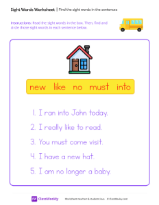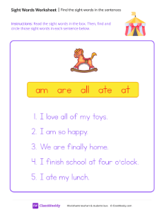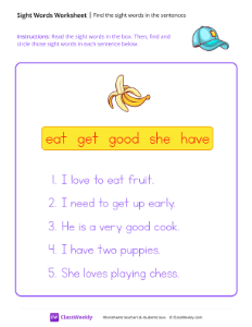 Worksheet instructions: Read the sight words in the box. Then, find and circle those sight words in each sentence below.