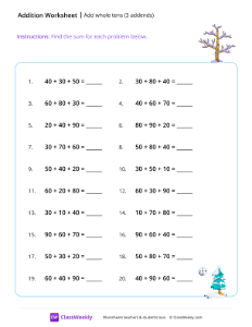 In this worksheet, students practice adding three 2-digit whole tens (such as 20 + 30 + 40). This helps strengthen mental math skills, enhances place value understanding, and builds fluency with multi-step addition. Worksheet instructions: Find the sum for each problem.