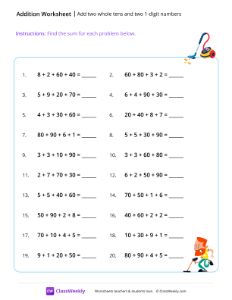 In this addition worksheet, students practice adding two whole tens (like 20, 40, 60, etc.) and two 1-digit numbers. This helps build mental math fluency, reinforce place value, and improve multi-step problem solving (tip: add the "tens" first, then add the "ones"). Worksheet instructions: Find the sum for each problem below.