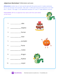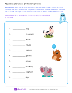 Alliteration is when two or more words start with the same sound. It makes sentences fun to say and hear! For example: "Silly seals" is alliteration because both words start with the "s" sound. "Thin tiger" is not alliteration because "th" and "t" make different sounds. Worksheet instructions: Write an adjective that starts with the same letter as the noun.