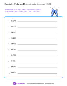 This worksheet helps students practice writing numbers up to 100,000 in expanded notation. Worksheet instructions: Write the numbers in expanded notation. For example: 6,458 = 6 x 1,000 + 4 x 100 + 5 x 10 + 8 x 1