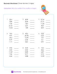 In this worksheet, students line up 5 numbers (from 0 to 100) with 1 or 2 decimal places in order. Worksheet instructions: Write the numbers from smallest to largest.