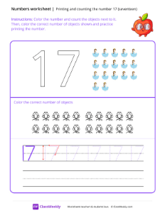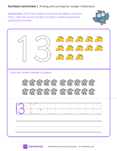 Worksheet instructions: Color the number and count the objects next to it. Then, color the correct number of objects shown and practice printing the number.