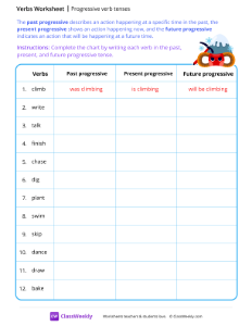 Remember, the past progressive describes an action happening at a specific time in the past, the present progressive shows an action happening now, and the future progressive indicates an action that will be happening at a future time. Worksheet instructions: Complete the chart by writing each verb in the past, present, and future progressive tense.