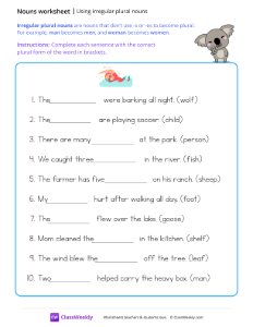Irregular plural nouns are nouns that don’t use -s or -es to become plural. For example, man becomes men, and woman becomes women. Worksheet instructions: Complete each sentence with the correct plural form of the word in brackets.