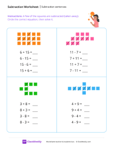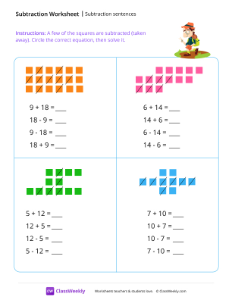 In this worksheet, students choose the subtraction sentences that match the picture. This is an excellent way for helping kids understand subtraction. Worksheet instructions: A few of the squares are subtracted (taken away). Circle the correct equation, then solve it.