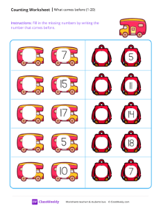 This worksheet helps students practice number sequencing by identifying what number comes before a given number between 1 and 20. A great resource for building counting skills and number sense. Worksheet instructions: Fill in the missing numbers by writing the number that comes before.