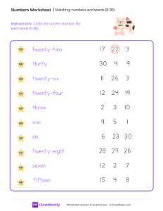 Worksheet instructions: Circle the correct number for each word (0-30).