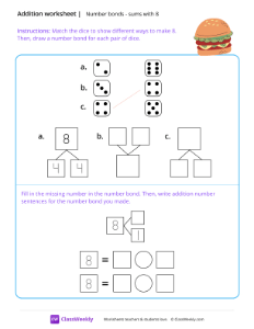 Worksheet instructions: Match the dice to show different ways to make 8. Then, draw a number bond for each pair of dice. Afterwards, make 2 number sentences.